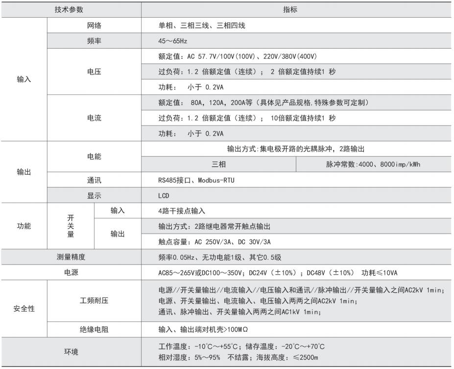 外置開(kāi)合式互感器的導(dǎo)軌式多功能電力儀表,適用于冶煉、鋼鐵、電焊、半導(dǎo)體等高能耗行業(yè)的節(jié)能改造工程,也適用于分布式光伏并網(wǎng)柜的功率監(jiān)測(cè)、電力需求側(cè)管理等應(yīng)用。具有無(wú)需拆一次母線(xiàn)、接線(xiàn)簡(jiǎn)單方便、施工安全,為用戶(hù)節(jié)約改造成本、提高效率等特點(diǎn)。它集成全部電力參數(shù)的測(cè)量(如單相或者三相的電流、電壓、有功功率、無(wú)功功率、視在功率、頻率、功率因數(shù))以及電能監(jiān)測(cè)和考核管理。同時(shí)它具有多種外圍接口功能可供用戶(hù)選擇:帶有RS485通訊接口,采用MODBUS-RTU協(xié)議可滿(mǎn)足通訊聯(lián)網(wǎng)管理的需要;帶開(kāi)關(guān)量輸入和繼電器輸出可實(shí)現(xiàn)斷路器開(kāi)關(guān)的“遙信”和“遙控”的功能,采用LCD顯示界面,通過(guò)面板按鍵來(lái)實(shí)現(xiàn)參數(shù)設(shè)置和控制,非常適合于實(shí)時(shí)電力監(jiān)控系統(tǒng)。