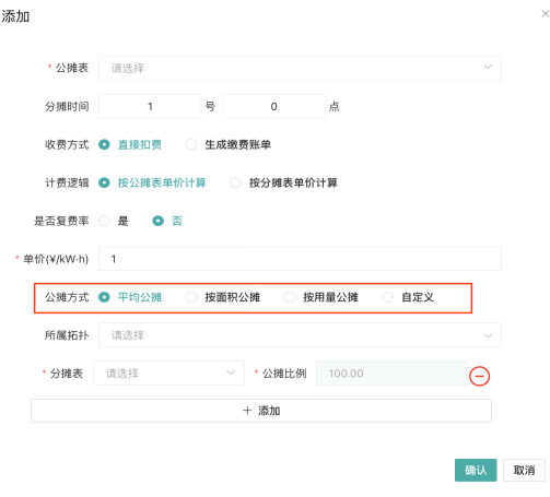分?jǐn)偡绞街С止潭▎蝺r(jià)、比例分?jǐn)?、面積分?jǐn)?、用電量分?jǐn)偅?/span>