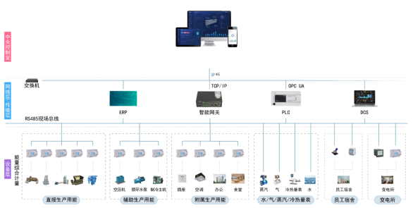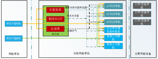 根據(jù)企業(yè)管理架構建設三級計量,接入成品產(chǎn)量/中間產(chǎn)品產(chǎn)量數(shù)據(jù)核算各級單耗數(shù)據(jù),即能源利用效率;對于動力設備,核算制冷系統(tǒng)能效比,水泵效率等等能源轉換效率。