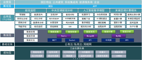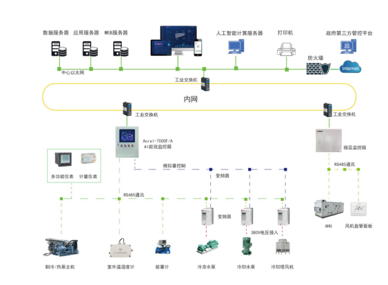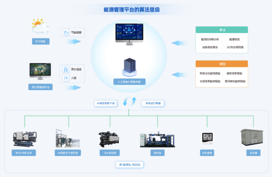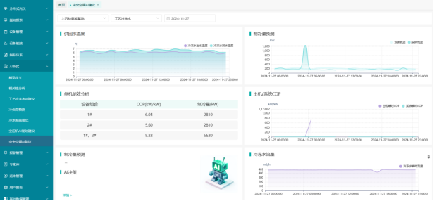 通過AI能效監(jiān)控箱與樓層監(jiān)控箱整體監(jiān)控冷熱源水系統(tǒng)與末端風系統(tǒng)運行狀況;通過對天氣、建筑以及集中式空調系統(tǒng)負荷進行預測,將有助于超前實現(xiàn)對系統(tǒng)運行的干預,指導用戶合理開關機,并對冷機進行群控及優(yōu)化,實現(xiàn)系統(tǒng)經(jīng)濟運行。