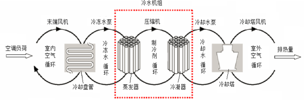 中央空調系統(tǒng)一般主要由制冷壓縮機、冷凍循環(huán)水設備、冷卻循環(huán)水設備、末端風機設備、冷卻塔風機設備等組成。主要通過五大循環(huán),即水泵、風機等動力設備形成一個能量的搬運系統(tǒng),把目標區(qū)域的能量搬運至室外。