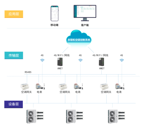 空調專用網(wǎng)關對接多聯(lián)機室外機,安裝電表計量電耗。通過Anet實現(xiàn)遠程節(jié)能控制多聯(lián)機室內(nèi)機啟停及計費。