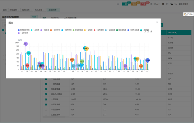 監(jiān)測末端空調總用電量、單臺空調用電量等。按建筑、房間拓撲監(jiān)測房間空調日、月、年用電量。按不同時段,對比查看多個房間用電量。