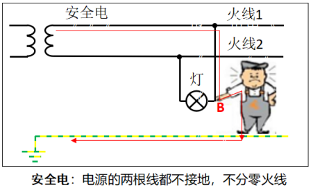 【電不傷人】人站在地上,人體碰到火線(圖中B點),火線1的電流無法經人體、大地回到電源端火線2。構不成電流回路,不會有電流流經人體,人不會觸電;