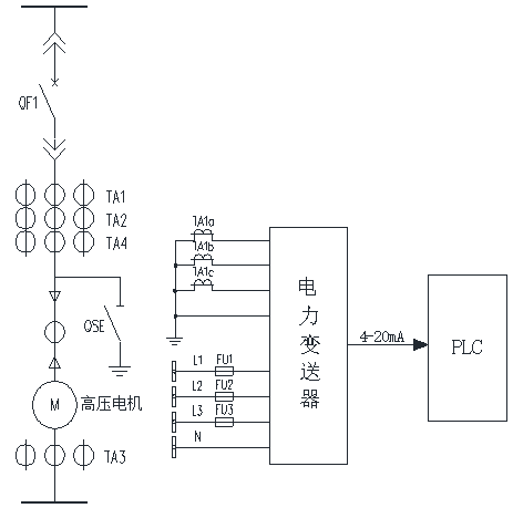 磨漿機(jī)10kV高壓系統(tǒng)電路圖如圖2所示。功率變送器通過裝在磨漿機(jī)10kV高壓電機(jī)線路中的電壓互感器和電流互感器,采集電壓和電流,從而檢測磨漿機(jī)10kV高壓電機(jī)的功率,功率變送器以4mA表示功率信號的零點(diǎn),用20mA表示功率信號的滿刻度,然后將功率信號以DC4-20mA成比例關(guān)系線性輸出,傳至PLC。PLC根據(jù)功率信號動(dòng)態(tài)地調(diào)節(jié)磨漿機(jī)的刀距,控制進(jìn)刀或退刀,從而實(shí)現(xiàn)恒功率打漿控制。