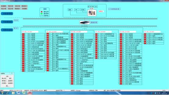 通訊示意圖為拓撲圖,顯示系統(tǒng)與儀表的通訊是否正常。通過界面模塊顏色的變化來反映整個系統(tǒng)各個監(jiān)控點位的運行狀態(tài)。界面如圖2所示。