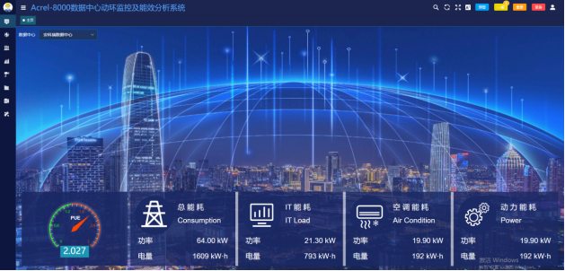 6.3.1 主頁查看:主頁展示當(dāng)前數(shù)據(jù)中心PUE值,總能耗,IT能耗,空調(diào)能耗,及其他能耗。
