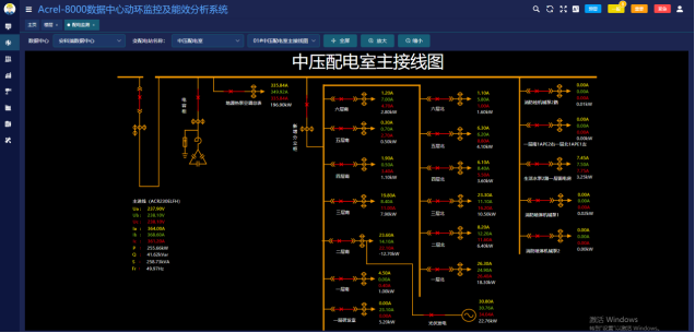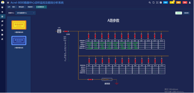 1)配電監(jiān)測可以通過一次圖形式幫助用戶了解每一個機(jī)柜的運(yùn)行情況,數(shù)據(jù)實時刷新。