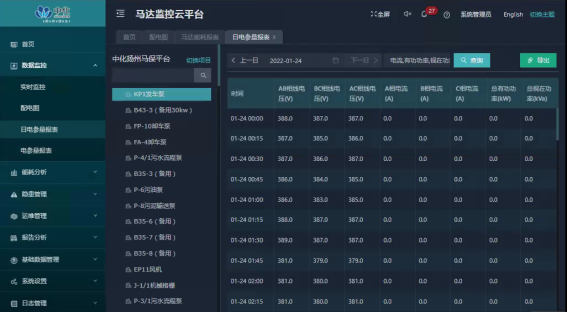 庫(kù)區(qū)109臺(tái)機(jī)泵運(yùn)行電流實(shí)時(shí)顯示,能導(dǎo)出單臺(tái)機(jī)泵選定時(shí)間段運(yùn)行電流曲線、數(shù)據(jù)表,也能導(dǎo)出全部機(jī)泵選定時(shí)間段運(yùn)行電流數(shù)據(jù);