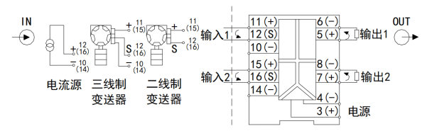 由于某集團水處理現(xiàn)場非電量傳感器安裝條件的限制,其模擬量輸出信號需擴展才能解決1路4~2OmA模擬量信號同時傳輸給2套不同控制和監(jiān)測系統(tǒng)的問題,現(xiàn)場的互感器接線方式屬于二線制,需要給現(xiàn)場的傳感器提供一路隔離的電源。單路DC4~20mA模擬量擴展出雙路DC4~20mA的輸出信號,實現(xiàn)了水處理控制、監(jiān)測系統(tǒng)的相對獨立。該方式隔離強度高、負載能力強、安裝接線簡單、運行穩(wěn)定、安全可靠,同時解決了水處理現(xiàn)場傳感器安裝帶來的問題。