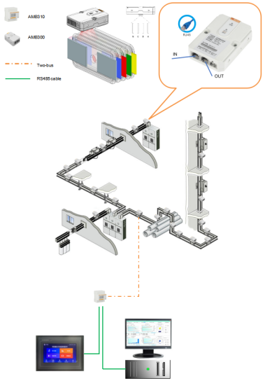 此母線槽紅外測(cè)溫解決方案由人機(jī)HMI觸摸屏,紅外測(cè)溫模塊,紅外采集器,電源模塊組成。該系統(tǒng)通過(guò)RS485線與本地觸摸屏和后臺(tái)監(jiān)控進(jìn)行通信(如下圖),系統(tǒng)設(shè)計(jì)遵循際標(biāo)準(zhǔn)Modbus-RTU傳輸規(guī)約,安全性、可靠性和開(kāi)放性都得到了很大地提高。RS-485作為一種串行通信的接口具有傳輸距離長(zhǎng)、速度較高、電平兼容性好、使用靈活方便、成本低廉和可靠度高等特點(diǎn),與無(wú)線通信方式相比,具有價(jià)格低、抗共模干擾能力強(qiáng)等優(yōu)點(diǎn)。